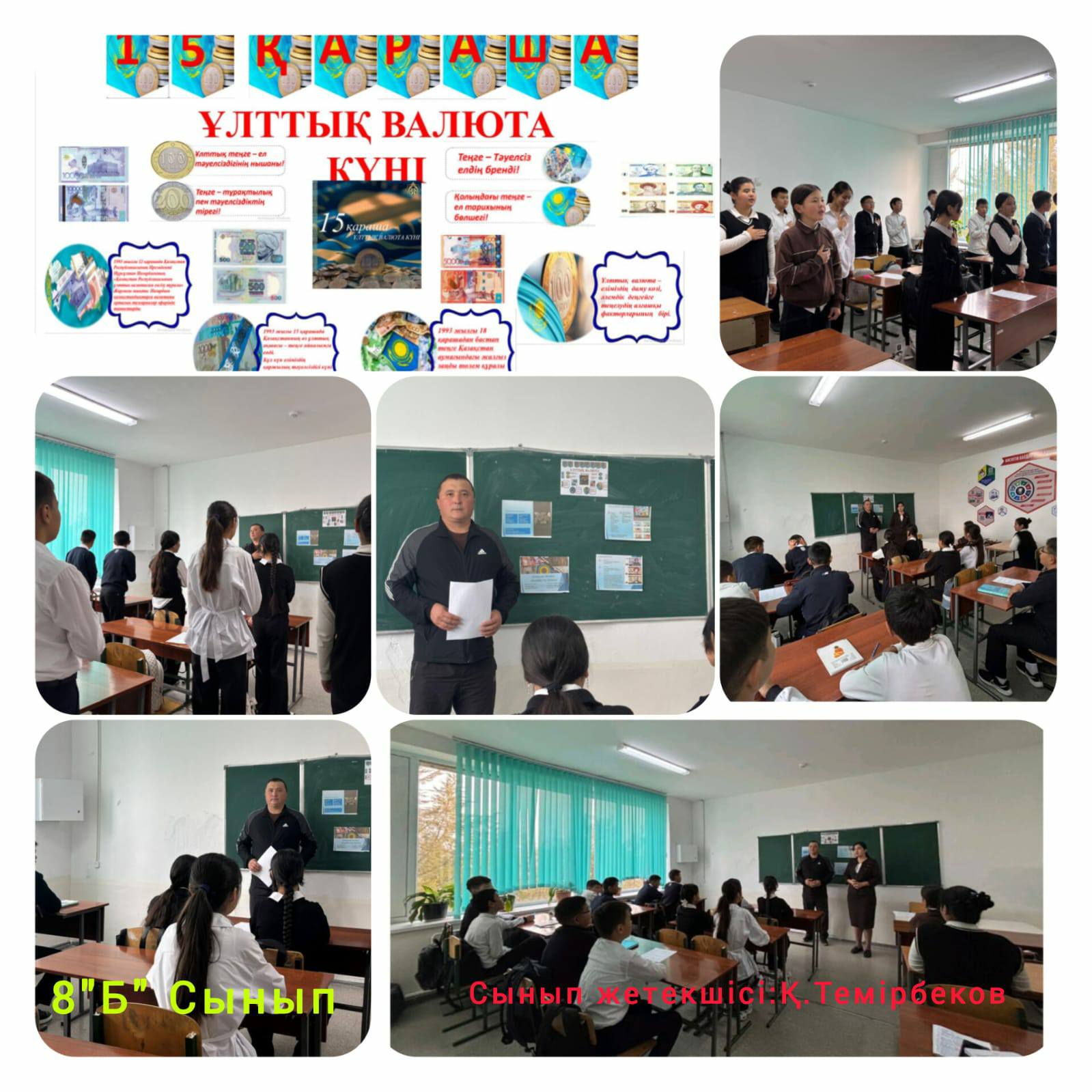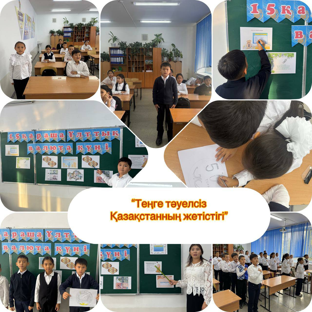 «Ұлттық валюта-теңге», «Теңге — Тәуелсіздіктің тірегі» тақырыбында тәрбие сағаттары ұйымдастырылды. Интерактивті слайдтар, бейнематериалдар көрсетіліп, сұрақ-жауап, топтық тапсырмалар ұйымдастырылды. Оқушылар өз ойларымен бөлісіп, теңгенің еліміз үшін қандай рөл атқаратыны жөнінде пікір алмасты.