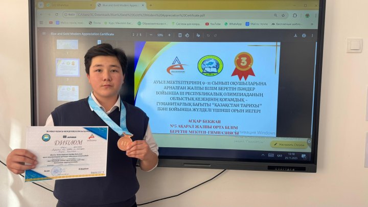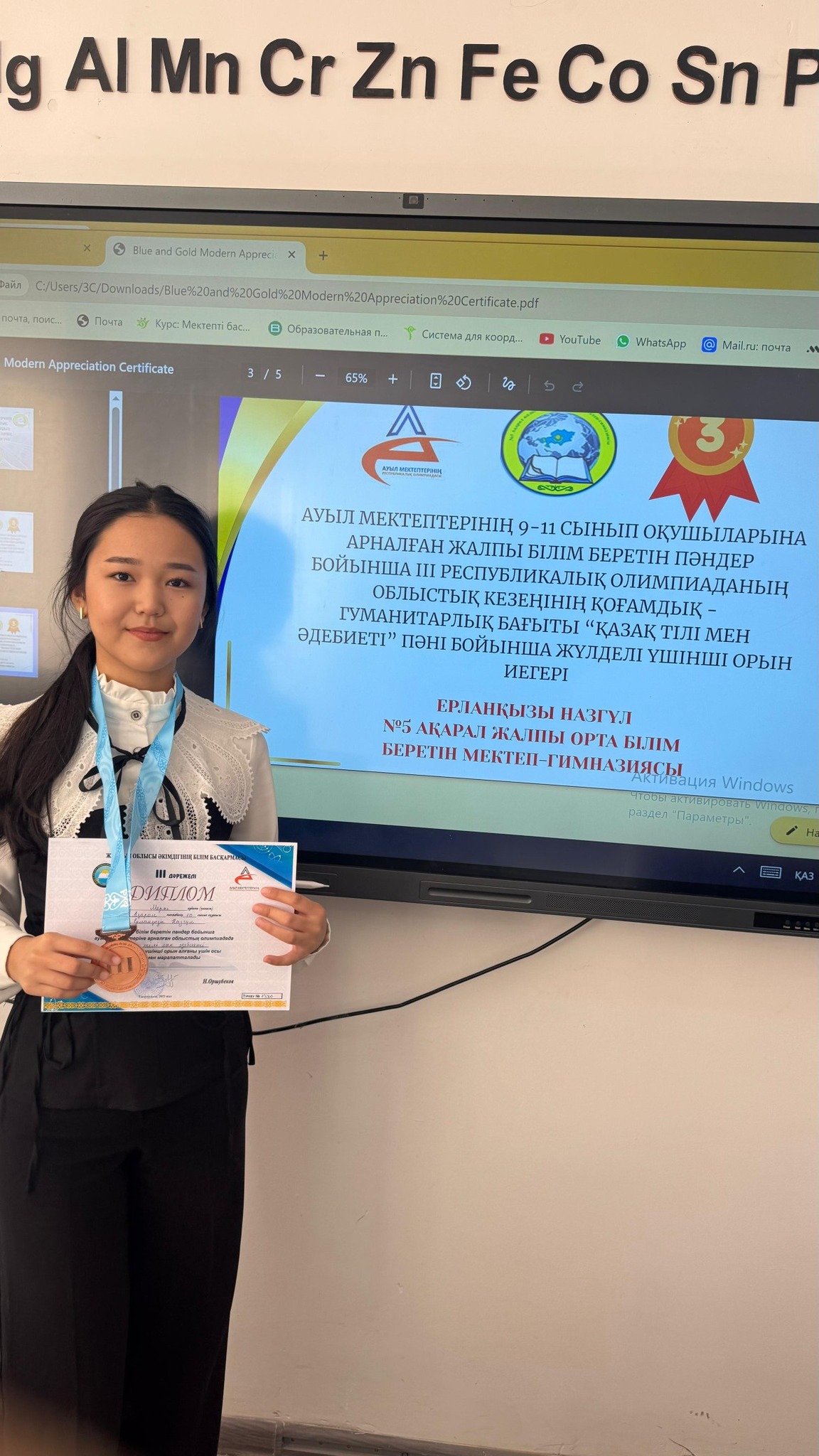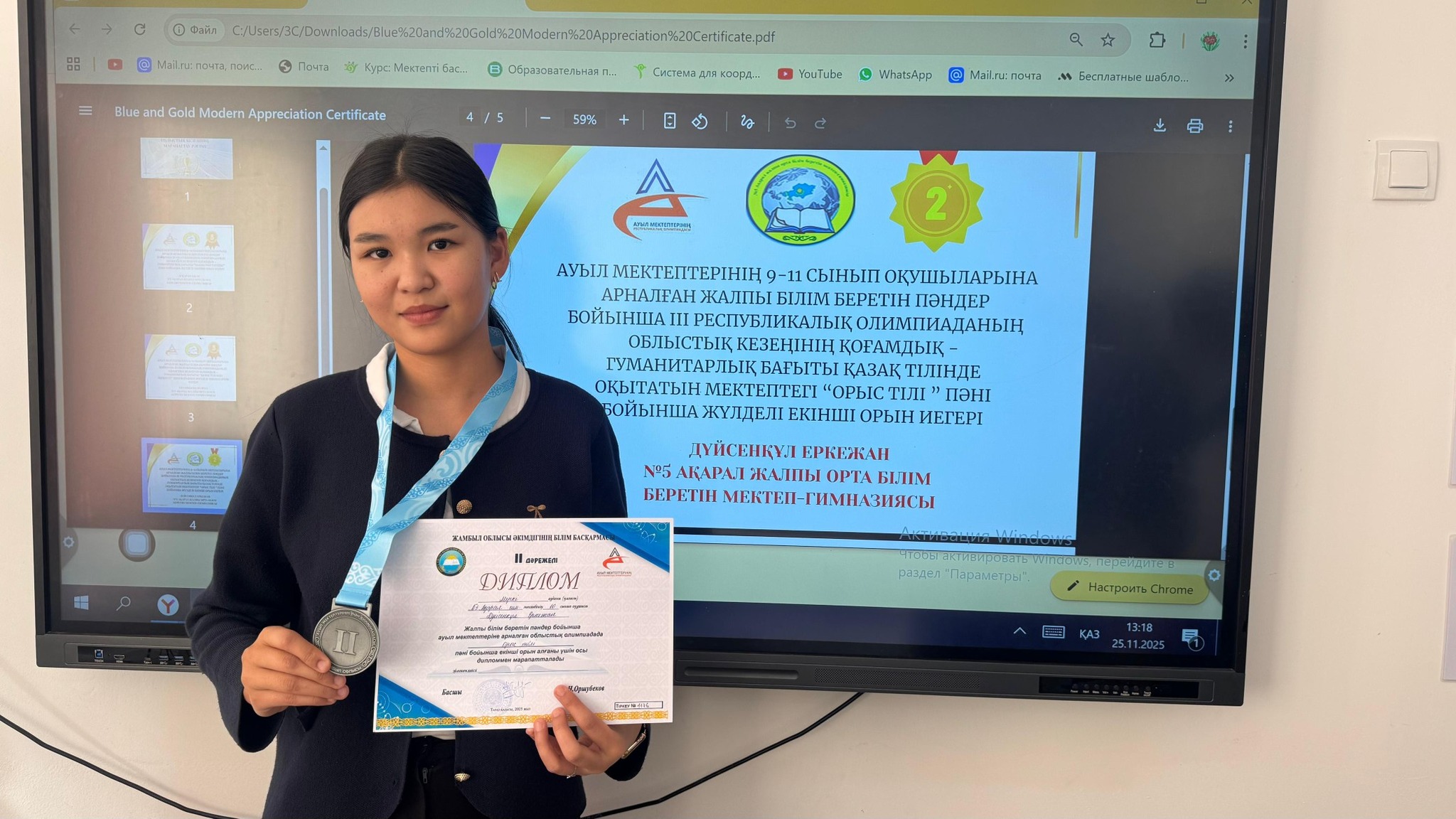 Қазақстан Республикасының Оқу-ағарту министрлігінің ұйымдастыруымен Ауыл мектептерінің 9-11 сынып оқушыларына арналған жалпы білім беретін пәндер бойынша республикалық олимпиаданың облыстық кезеңнен қоғамдық-гуманитарлық бағыттағы: қазақ тілі мен әдебиеті, Қазақстан тарихы мен қазақ тілінде оқытатын мектептердегі орыс тілі пәндері бойынша жүлделі орын алған Дүйсенқұл Еркежан, Ерланқызы Назгүл мен Асқар Бекжан салтанатты түрде марапатталды. Құттықтаймыз!!!
